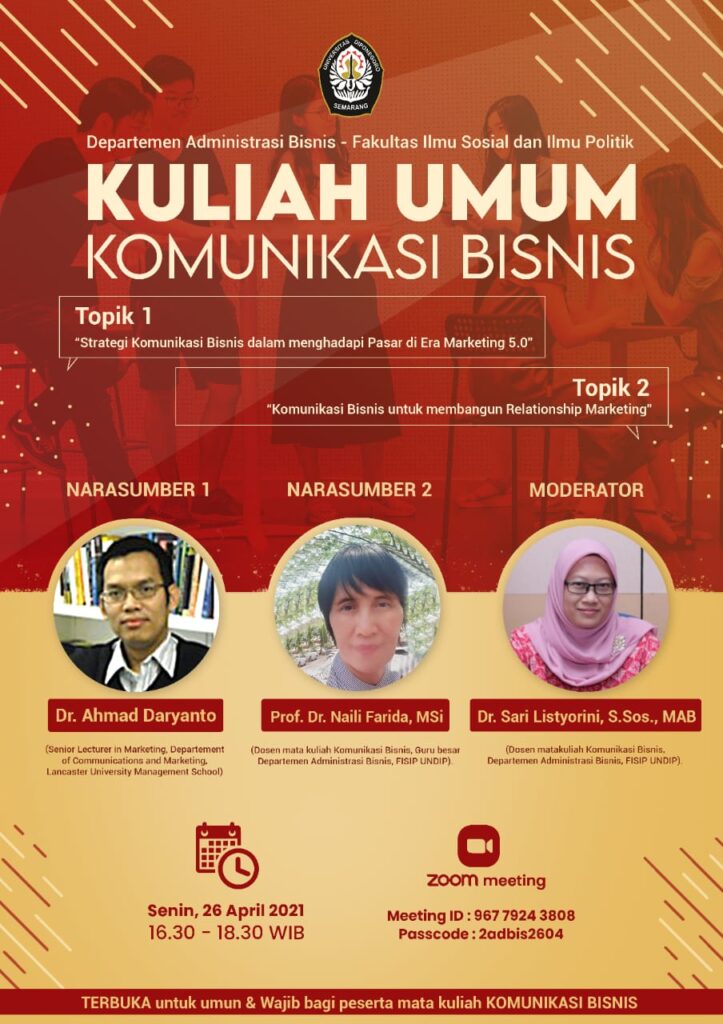 Kuliah Umum Komunikasi Bisnis : Topik (Strategi Komunikasi Bisnis dalam menghadapi Pasar di Era Marketing 5.0) dan (Komunikasi Bisnis untuk membangun Relationship Marketing)