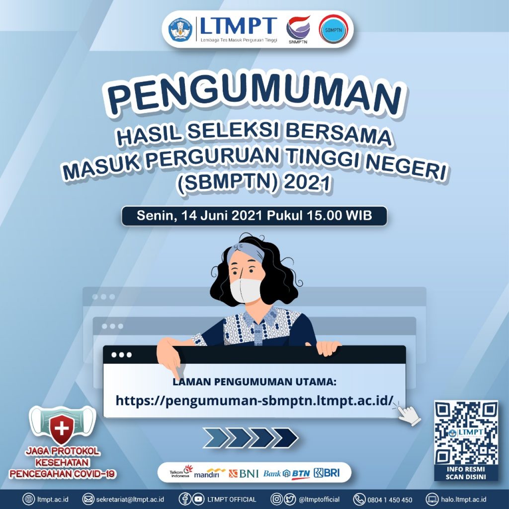The announcement of the 2021 LTMPT SBMPTN Selection Results can be accessed on June 14, 2021 at 15.00 WIB through the link below: sbmptn.undip.ac.id Source: ltmpt.ac.id