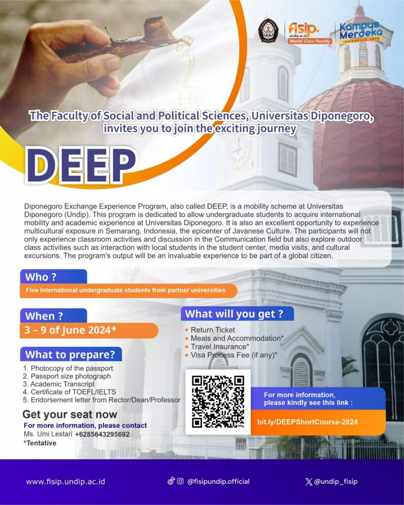 Semarang (08/05) – Internationalizing education remains a primary focus for universities in Indonesia. This was evident in the visit of the Social and Political Sciences (Fisipol) team from Muhammadiyah University of Yogyakarta (UMY) to the Faculty of Social and Political Sciences (FISIP) at Universitas Diponegoro (Undip) for benchmarking purposes in preparation for international accreditation assessment […]
