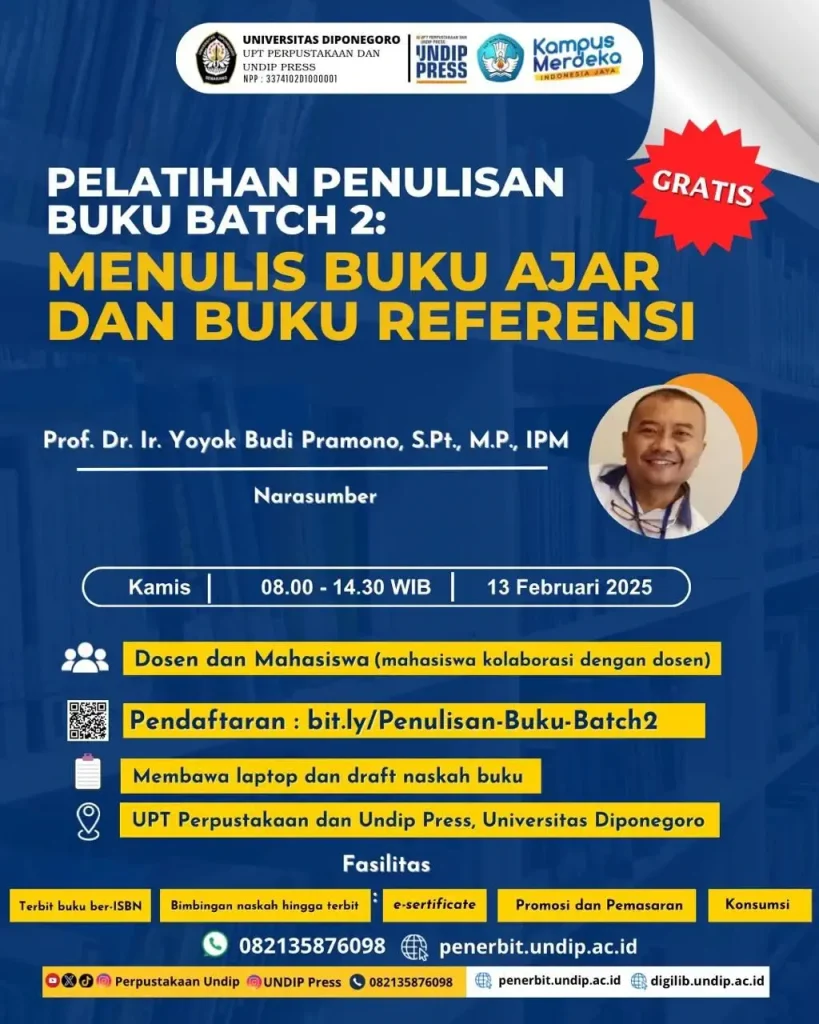 Diponegoro University (Undip) through the UPT Library and Undip Press will hold a Book Writing Training Batch 2 with the theme “Writing Textbooks and Reference Books”. This training aims to enhance the skills of academics, researchers, and students in writing textbooks and reference books. The training will be delivered by an experienced speaker, Prof. Dr. […]