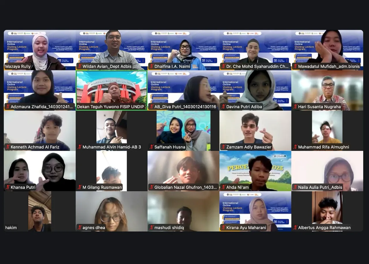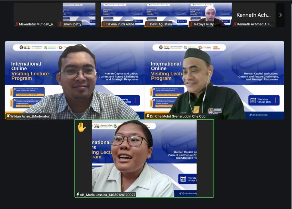 The Department of Business Administration, Faculty of Social and Political Sciences, Universitas Diponegoro (FISIP UNDIP), successfully organized an International Online Visiting Lecture Program on Thursday, 18 September 2025 through the Zoom platform. The program carried the theme “Human Capital and Labor: Current and Future Challenges, and Strategic Responses”, reflecting the faculty’s commitment to advancing academic discourse on contemporary issues in labor and human capital development.