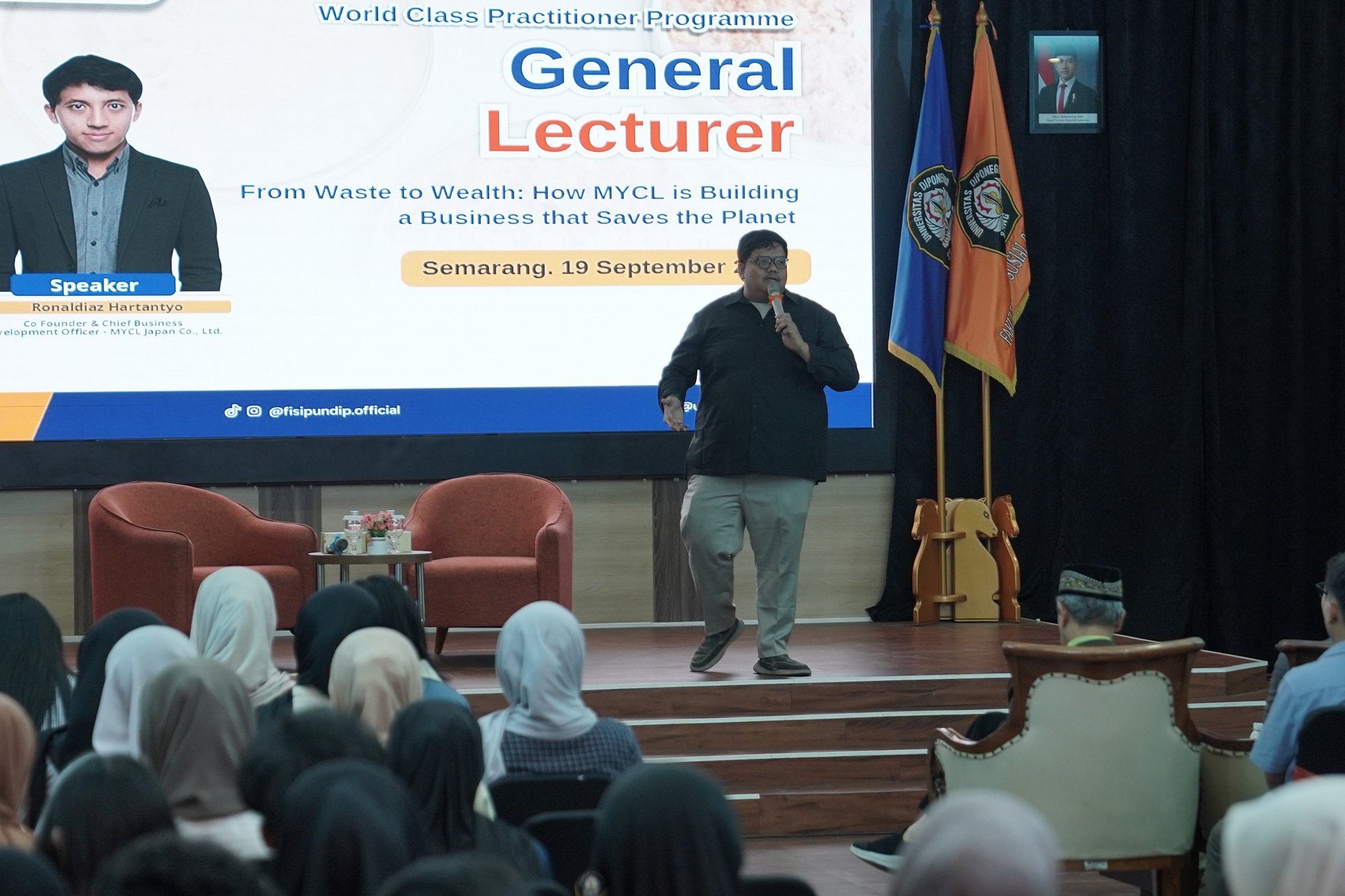 Semarang, September 19, 2025 — The Faculty of Social and Political Sciences, Diponegoro University (FISIP UNDIP), successfully hosted a public lecture featuring Ronaldiaz Hartantyo—widely known as Pak Aldi—Co-Founder and Chief Business Development Officer of MYCL Japan Co., Ltd. The lecture, titled “Turning Waste into Wealth: How MYCL Builds a Business That Saves the Planet”, was held at the FIMENA Auditorium of FISIP UNDIP, drawing an audience of more than 230 participants, including students, lecturers, and professionals from various sectors.