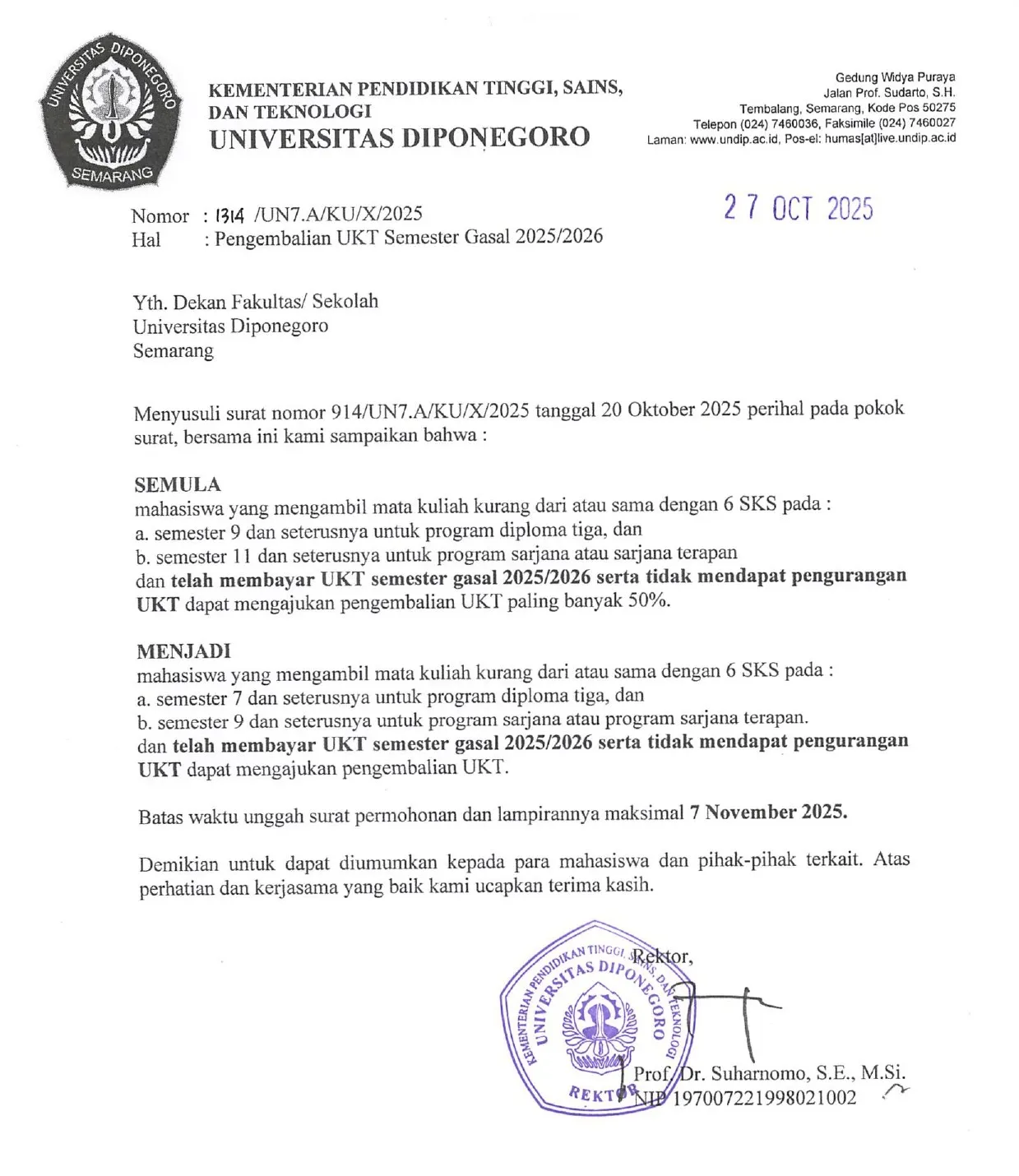Diponegoro University has issued a new policy regarding the refund of the Single Tuition Fee (UKT) for the Odd Semester of the 2025/2026 academic year. This policy is an improvement from the previous regulation and expands the eligibility criteria for students who can apply for a UKT refund.