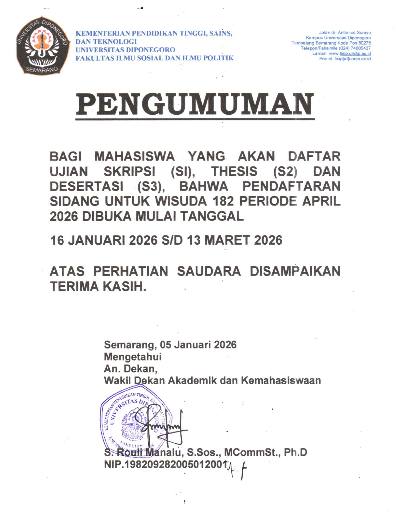 Semarang, January 6, 2026 – The Faculty has opened registration for final examinations for undergraduate (S1), master’s (S2), and doctoral (S3) students who will participate in the Graduation 182 ceremony in the April 2026 period. Registration is open from January 16, 2026, to March 13, 2026.