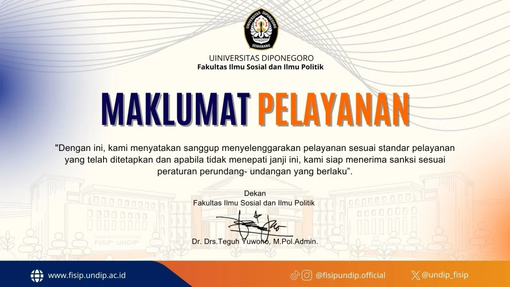 Semarang – The Faculty of Social and Political Sciences (FISIP) at Diponegoro University (Undip) has issued a service proclamation as a form of commitment to providing excellent service to students and the community. In an official statement signed by the Dean, Dr. Drs. Teguh Yuwono, M.Pol.Admin., FISIP Undip declared its readiness to organize services in accordance […]