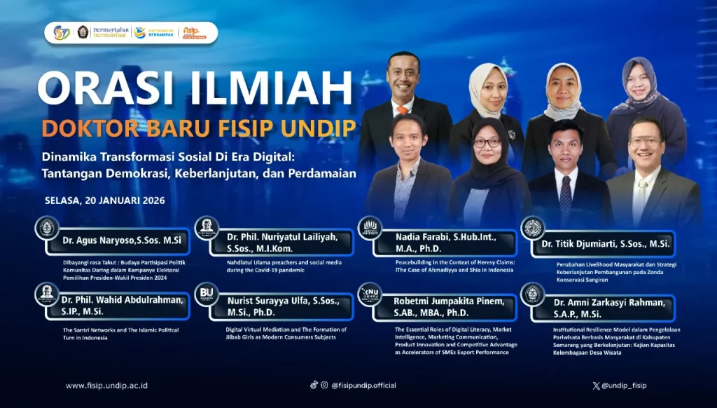 Semarang, January 20, 2026 – The Faculty of Social and Political Sciences (FISIP), Universitas Diponegoro (UNDIP), held the Scientific Orations of Newly Graduated Doctors of FISIP UNDIP – Session 2 as part of its commitment to FISIP UNDIP Impactful, delivering academic excellence that is simultaneously dignified and beneficial to society. Carrying the theme “Socio-Political Institutional Resilience in Addressing the Challenges of Modernization, […]