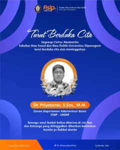 Semarang, Monday, 11/12. Dr. Priyotomo, S.Sos., M.M., a lecturer at the Department of Business Administration, Faculty of Social and Political Sciences, Universitas Diponegoro, has passed away and returned to the mercy of God. The funeral service will take place at Dr. Kariadi Hospital, Semarang, with the burial at the Purbalingga