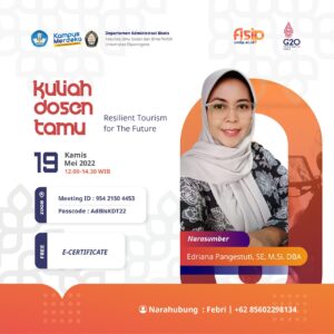 The Department of Business Administration, Faculty of Social and Political Sciences, Universitas Diponegoro held a Guest Lecturer on Resilient Tourism for The Future with Edriana Pangestuti, S.E., M.Sc., DBA (Chairman of UB Tourism Studies Center/Head of Tourism Laboratory FIA UB) as the speaker, Thursday (19/5). In her presentation on “The