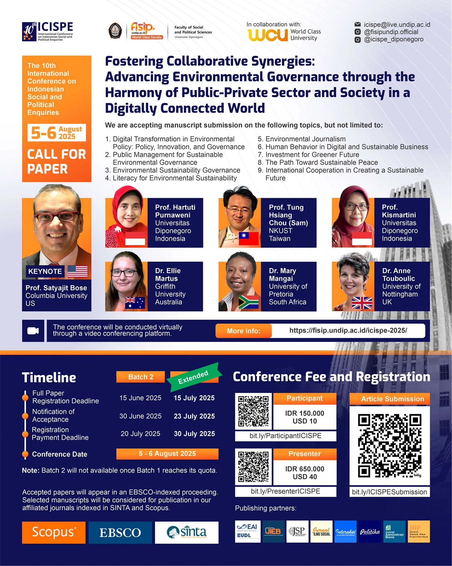 The 10th International Conference on Indonesian Social and Political Enquiries (ICISPE) looks at how environmental policy is changing in a world that is becoming more and more digital. It focuses on how governance, communication, and sustainable development are all coming together. This conference explores green public policy as an essential tool for tackling environmental issues via regulatory frameworks and innovative policy instruments. This examines how sustainable governance can facilitate long-term commitments to environmental protection while ensuring that policy decisions align with social justice and ecological resilience. The conference emphasizes the importance of green communication and media in influencing public discourse, fostering environmental awareness, and galvanizing collective action via digital platforms. Discussions on international sustainable policy will examine the intricacies of global cooperation, highlighting how nations can unite to formulate a comprehensive strategy for environmental sustainability. Sustainable business practices will be looked at at the conference, with a focus on how digital transformation can help promote eco-friendly economic models, green finance, and corporate responsibility. This will make sure that economic growth is in line with environmental responsibility. ICISPE 2025 seeks to foster significant discussions and inventive solutions for a digitally interconnected and ecologically sustainable future through these themes.Keywords: environmentally conscious public policy, sustainable governance, ecological communication and media, global sustainable policy, and sustainable enterprise.