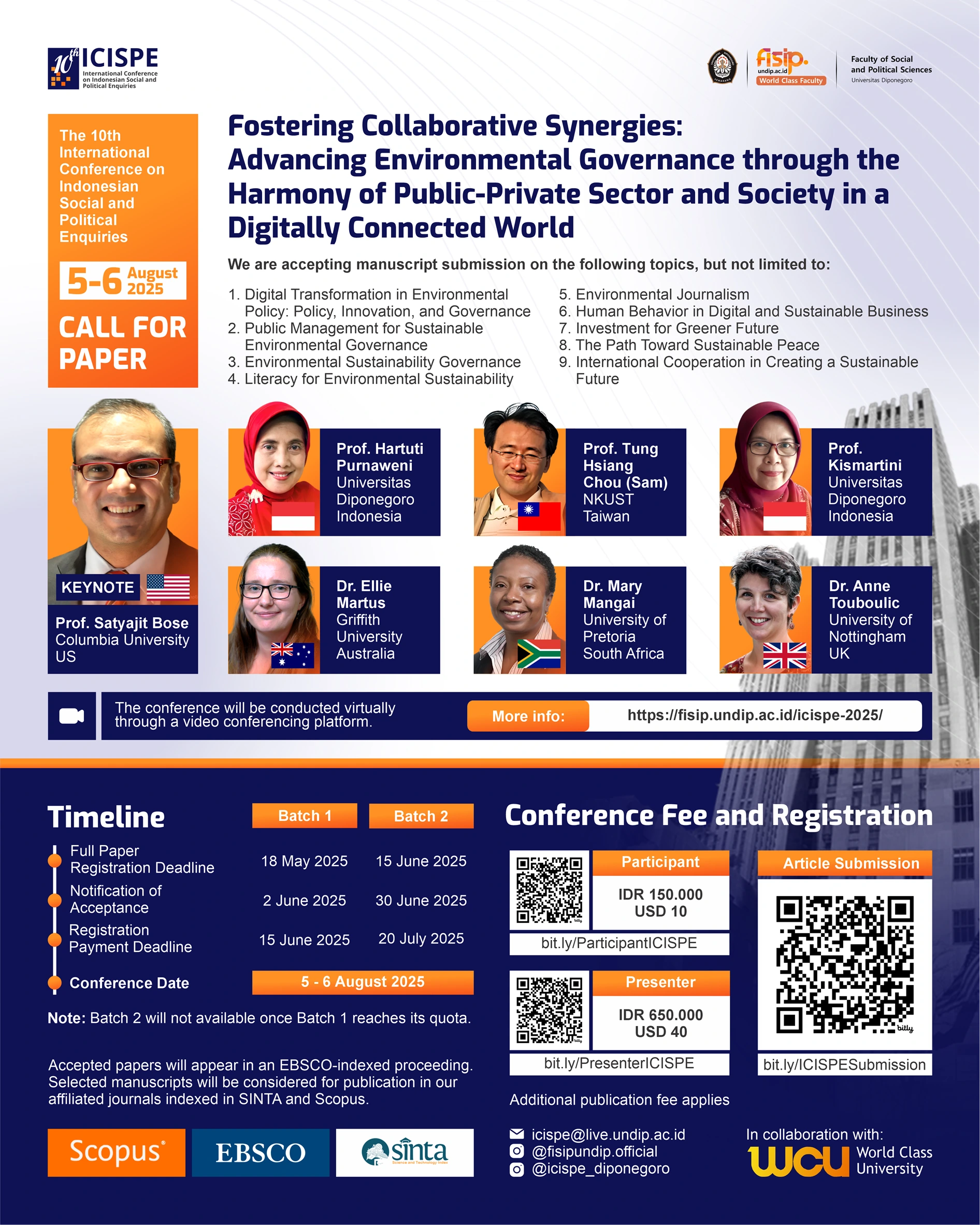 The 10th International Conference on Indonesian Social and Political Enquiries (ICISPE) looks at how environmental policy is changing in a world that is becoming more and more digital. It focuses on how governance, communication, and sustainable development are all coming together. This conference explores green public policy as an essential tool for tackling environmental issues via regulatory frameworks and innovative policy instruments. This examines how sustainable governance can facilitate long-term commitments to environmental protection while ensuring that policy decisions align with social justice and ecological resilience. The conference emphasizes the importance of green communication and media in influencing public discourse, fostering environmental awareness, and galvanizing collective action via digital platforms. Discussions on international sustainable policy will examine the intricacies of global cooperation, highlighting how nations can unite to formulate a comprehensive strategy for environmental sustainability. Sustainable business practices will be looked at at the conference, with a focus on how digital transformation can help promote eco-friendly economic models, green finance, and corporate responsibility. This will make sure that economic growth is in line with environmental responsibility. ICISPE 2025 seeks to foster significant discussions and inventive solutions for a digitally interconnected and ecologically sustainable future through these themes.Keywords: environmentally conscious public policy, sustainable governance, ecological communication and media, global sustainable policy, and sustainable enterprise.
