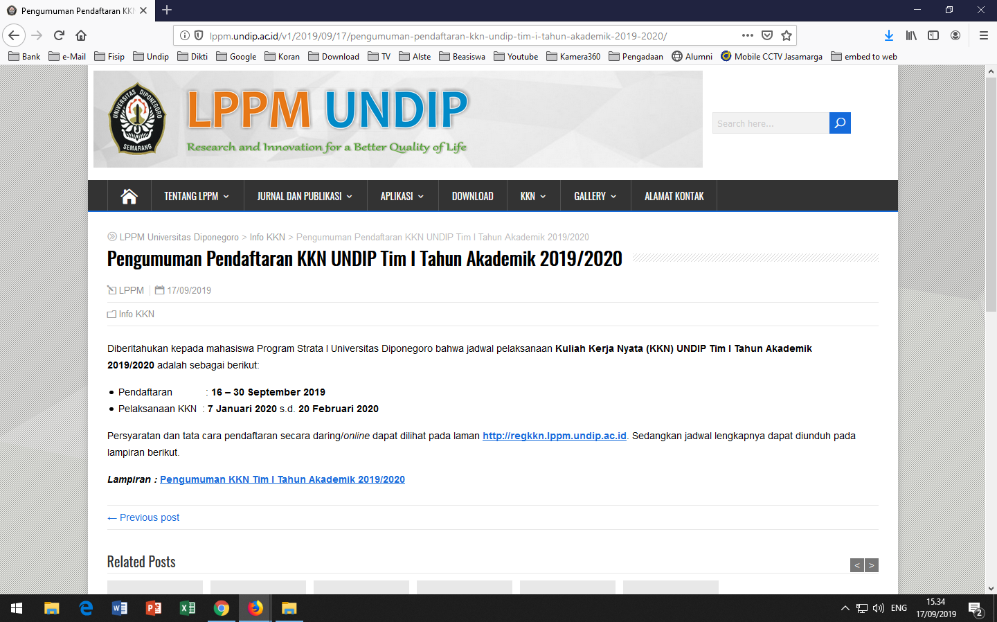 Diberitahukan kepada mahasiswa Program Strata I Universitas Diponegoro bahwa jadwal pelaksanaan Kuliah Kerja Nyata (KKN) UNDIP Tim I Tahun Akademik 2019/2020 adalah sebagai berikut: