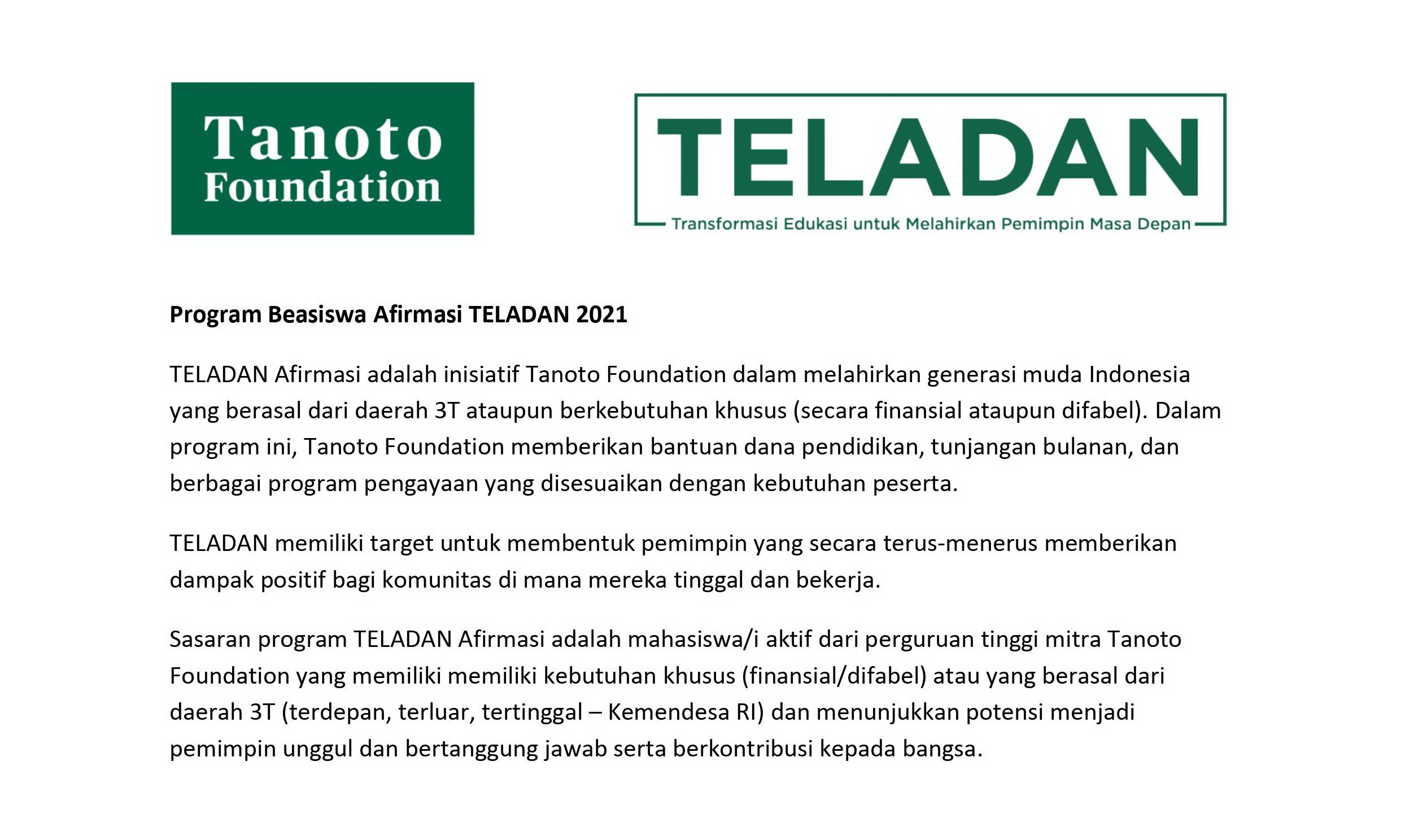 Pendaftaran Program Afirmasi TELADAN 2021 akan dibuka pada tanggal 28 Agustus s.d. 23 September 2020