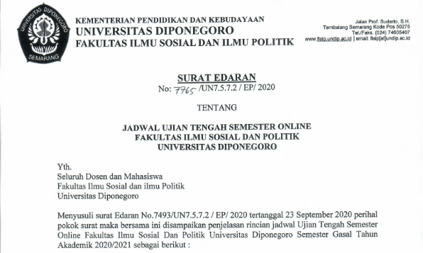 Surat Edaran Jadwal Pelaksanaan Ujian Tengah Semester Oktober 2020