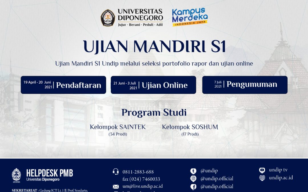 Untuk informasi lebih lengkap mengenai syarat-syarat, ketentuan-ketentuan dan juga jadwal Jalur Mandiri Undip ini dapat di akses di laman PENDAFTARAN MAHASISWA BARU JALUR UM S1 UNDIP