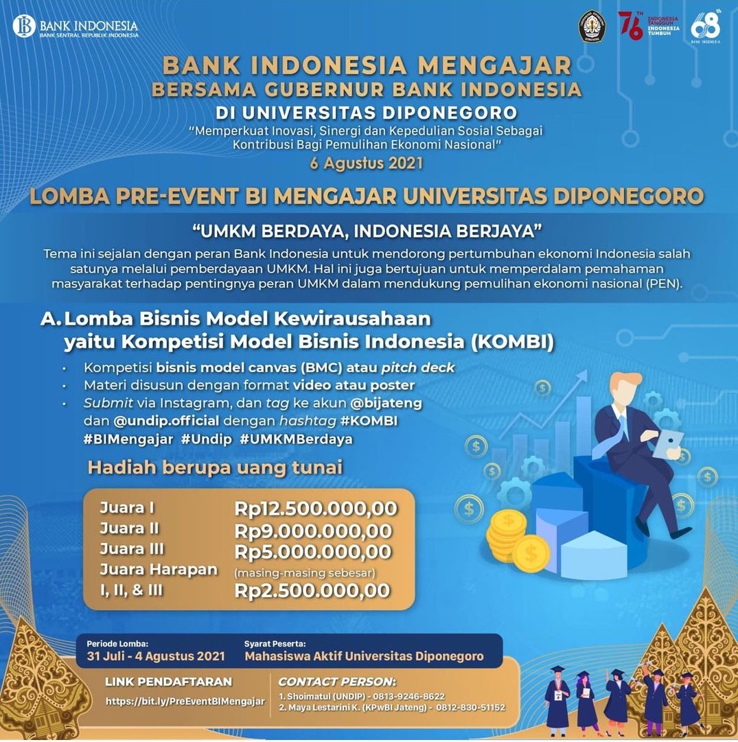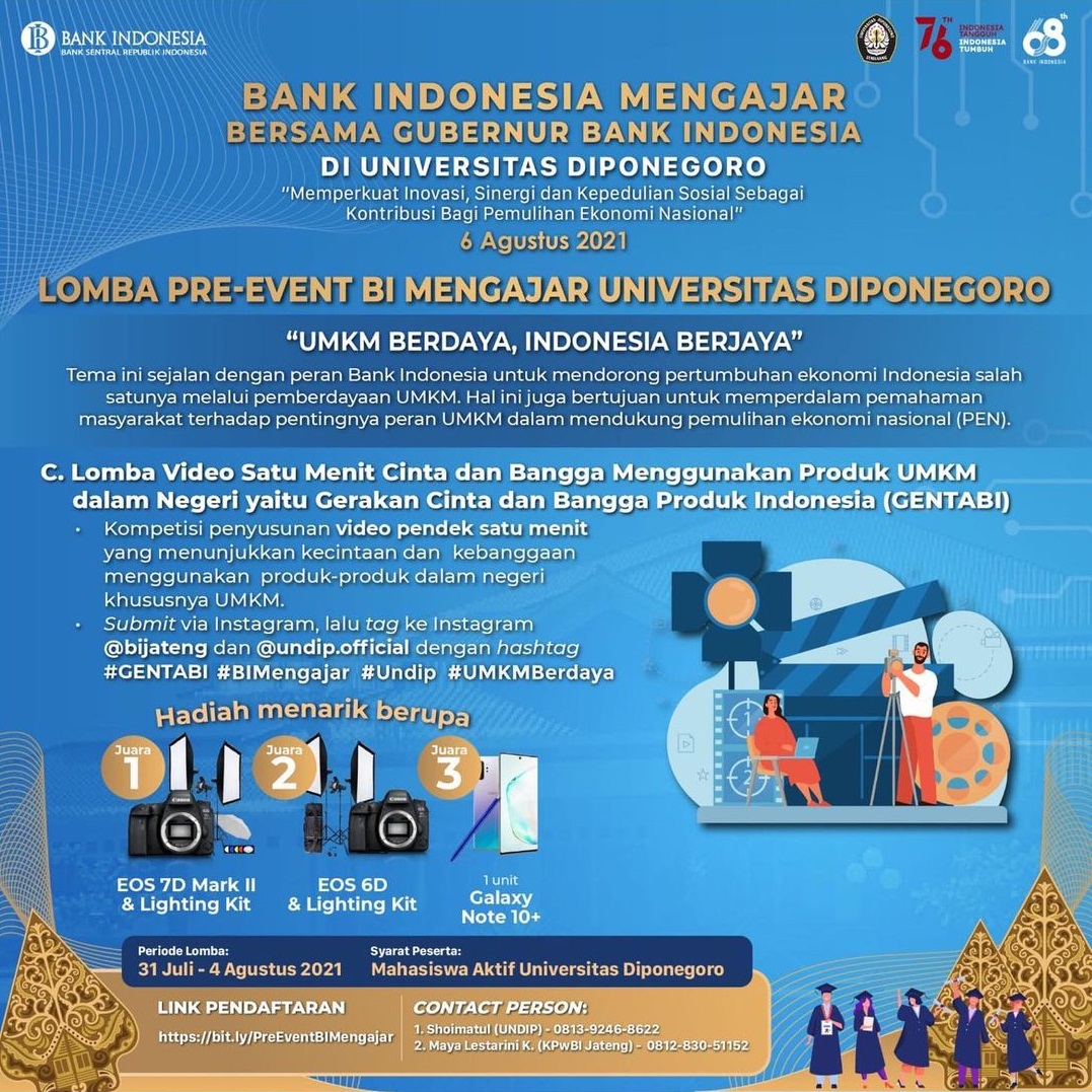 Undip mengundang mahasiswa untuk bergabung dalam acara kuliah Umum “BI Mengajar” pada 06 Agustus 2021 mendatang. Dan untuk memeriahkan acara tersebut, Undip juga mengajak semua mahasiswa Universitas Diponegoro untuk berkontribusi dengan mengikuti lomba Pre-Event dalam rangka membangkitkan kembali UMKM.