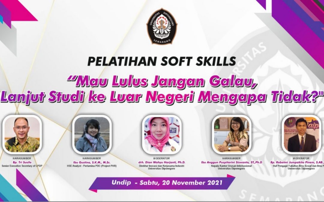 Dalam rangka membekali calon wisudawan agar mampu bersaing di dunia kerja dengan lulusan dari perguruan tinggi lainnya dan menyiapkan mahasiswa untuk mempersiapkan karirnya, Universitas Diponegoro (Undip) menyelenggarakan kegiatan pelatihan soft skills tahun 2021 dengan tema “Mau Lulus Jangan Galau, Lanjut Studi ke Luar Negeri Mengapa Tidak?”.