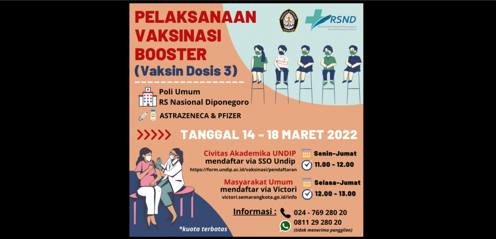Pelaksanaan vaksinasi Booster (Vaksin Dosis 3) menggunakan Vaksin ASTRAZENECA dan PFIZER, akan dilaksanakan kembali di Poli Umum RS Nasional Diponegoro, pada tanggal 14 Maret – 18 Maret 2022.