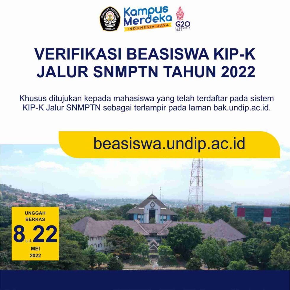 Bersama ini disampaikan bahwa bagi mahasiswa calon penerima beasiswa KIP-Kuliah Tahun 2022 jalur SNMPTN sebagaimana terlampir yang sudah dinyatakan lolos verifikasi sebagai mahasiswa baru diwajibkan untuk menyampaikan data dan berkas persyaratan melalui sistem beasiswa.undip.ac.id mulai 8 s.d. 22 Mei 2022. Data dan berkas persyaratan yang disampaikan akan dijadikan dasar kelolosan beasiswa dan harus dapat dipertanggungjawabkan kebenarannya.