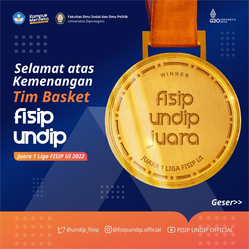 Selamat kepada Tim Bola Basket FISIP Undip (Globies) yang berhasil meraih juara 1 mengalahkan FISIP UNTAG 44-48 dalam turnamen bola basket Liga FISIP UI 2022. Dalam pertandingan yang berlangsung di Gymnasium Universitas Indonesia ini, Globies berhasil mengalahkan 19 Tim Basket dari berbagai mahasiswa rumpun sosial dan humaniora di Indonesia. Sekali lagi selamat atas kemenangannya, Globies!