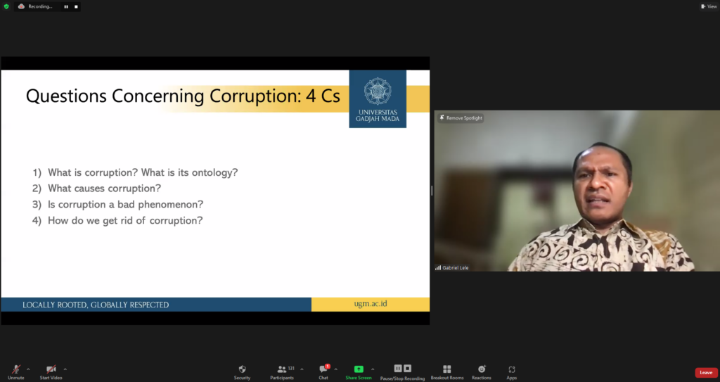 Selain itu, Gabriele dalam presentasinya memberikan komentarnya tentang buku Sylvia. Dia menyebutkan beberapa keunggulan dari buku itu. Buku tersebut memberikan perspektif dan gambaran kritis tentang korupsi dan good governance baik secara ontologis maupun aksiologis. Menurutnya, buku itu juga menggambarkan rasionalitas/individualisme vs relasionalitas/komunitarianisme, bagaimana korupsi dibingkai secara global (pemerintahan) tetapi distrategikan secara lokal, dan melengkapi tren “penelitian besar” dengan deskripsi yang lebih bernuansa dan kaya.