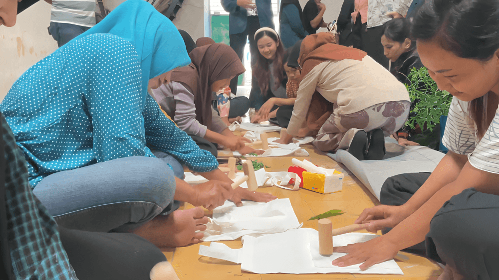 Pelatihan dipimpin oleh Ibu Sri Suharti SE., MM dan tim pengrajin batik ecoprint sedang menjelaskan kepada masyarakat tentang beberapa teknik pembuatan batik ecoprint