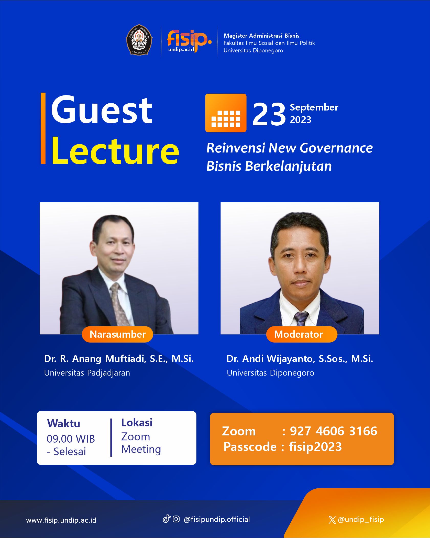 Kuliah Dosen Tamu Departemen Administrasi Bisnis dengan topik “Reinvensi New Governance Bisnis Berkelanjutan” adalah sebuah sesi pengajaran yang membahas strategi dan konsep terbaru dalam mengelola bisnis secara berkelanjutan. Dalam kuliah ini, seorang ahli dari Universitas Padjadjaran akan menjadi dosen tamu dan berbagi pengetahuan tentang bagaimana perusahaan dapat mengejar tujuan bisnis yang sukses sambil mempertimbangkan dampak sosial dan lingkungan.