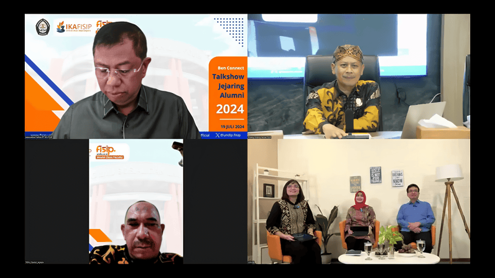 Talkshow diawali dengan sambutan dari Dekan FISIP Undip, Dr. Drs. Teguh Yuwono, M.Pol.Admin. Beliau menyampaikan harapannya agar acara ini dapat memperkuat jaringan alumni FISIP Undip dan berkontribusi pada pencapaian Undip secara keseluruhan. Dr. Teguh juga menekankan pentingnya peran alumni dalam meningkatkan Employability dan Outcome lulusan FISIP Undip, serta dalam membangun reputasi baik Fakultas di kancah internasional.