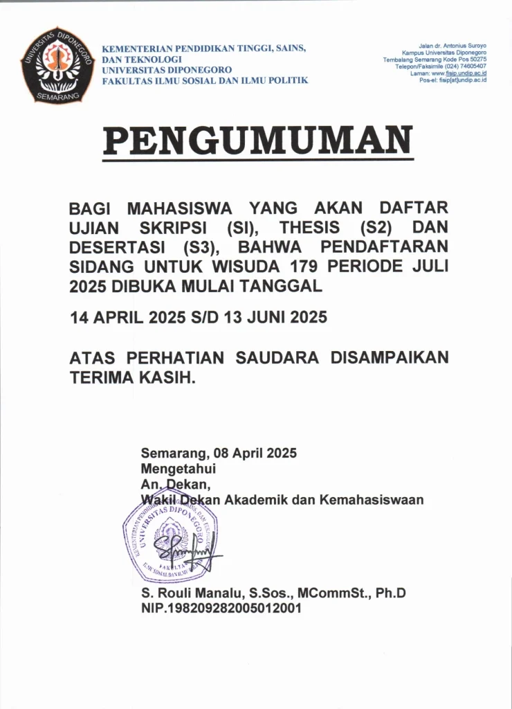 Diberitahukan kepada seluruh mahasiswa jenjang S1, S2, dan S3 bahwa pendaftaran sidang skripsi, thesis, serta disertasi untuk wisuda periode Juli 2025 telah dibuka. Proses pendaftaran berlangsung dari tanggal 14 April hingga 13 Juni 2025.