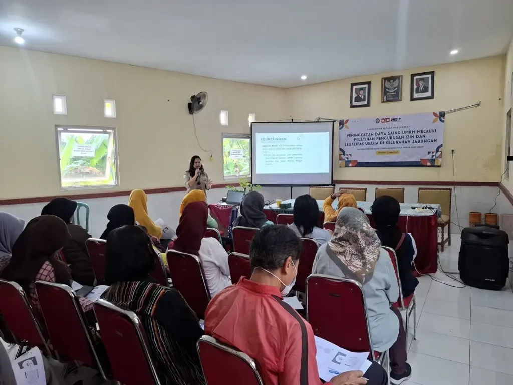 Semarang, 23 Mei 2025 – Departemen Administrasi Publik Fakultas Ilmu Sosial dan Ilmu Politik Universitas Diponegoro (FISIP UNDIP) kembali menegaskan komitmennya dalam pemberdayaan masyarakat melalui kegiatan pengabdian masyarakat mandiri bertajuk “Peningkatan Daya Saing UMKM Melalui Pelatihan Pengurusan Izin dan Legalitas Usaha di Kelurahan Jabungan.”
