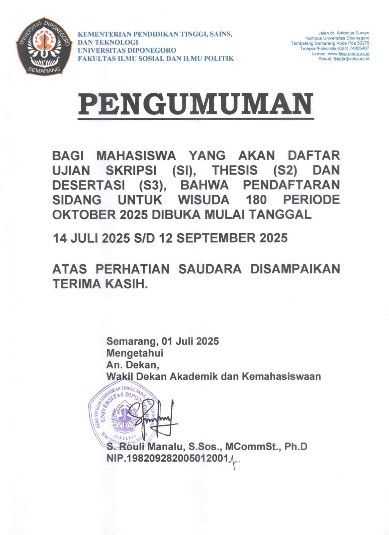 Fakultas Ilmu Sosial dan Ilmu Politik Universitas Diponegoro menginformasikan bahwa pendaftaran sidang Skripsi (S1), Tesis (S2), dan Disertasi (S3) untuk Wisuda ke-180 periode Oktober 2025 dibuka mulai tanggal 14 Juli 2025 hingga 12 September 2025. Mahasiswa yang akan mengikuti wisuda pada periode tersebut diharapkan segera melakukan pendaftaran sesuai jadwal. Informasi lebih lanjut dapat diperoleh melalui email: fisip[at]undip.ac.id. Terima kasih atas perhatian dan kerja samanya.