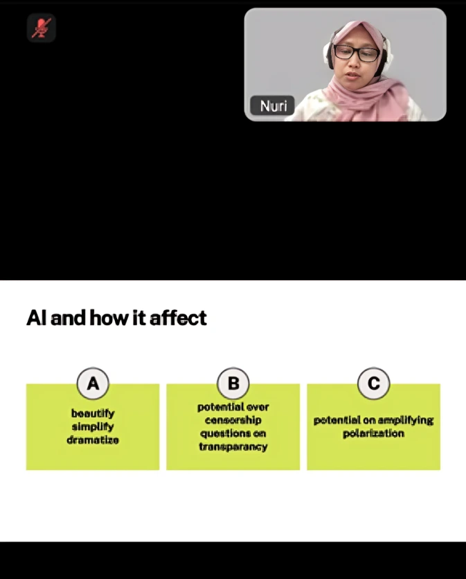 Di akhir sesi, Dr. Nuri mengajak peserta untuk berpikir lebih kritis tentang kondisi media sosial saat ini, terutama dengan penggunaan Kecerdasan Buatan (AI), serta dampaknya terhadap kebebasan berbicara. Ia mendorong para peserta untuk mempertimbangkan tantangan etis dan sosial yang ditimbulkan oleh AI dalam membentuk wacana publik.