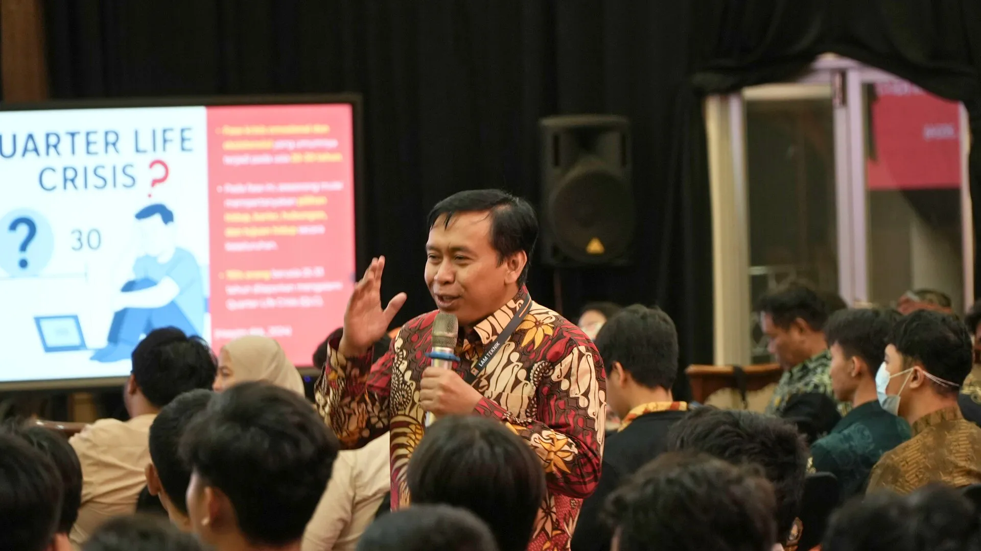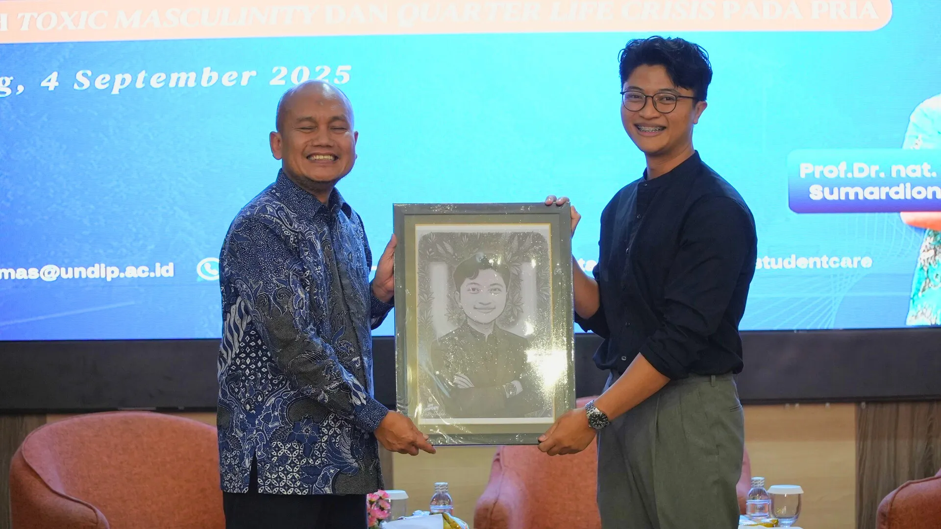 Acara kemudian menghadirkan dua narasumber ahli. Direktur Akademik Undip, Prof. Dr. nat. tech. Siswo Sumardiono, S.T., M.T., dalam pemaparannya menjelaskan fenomena Duck Syndrom dan tanda-tanda QLC pada pria, seperti tidak yakin dengan tujuan hidup, overthinking terhadap masa depan, merasa tidak cukup berhasil, dan kehilangan motivasi. Dengan gaya yang menenangkan, beliau berpesan, “dijalani saja, overthinking itu merusak masa depan kita”. Selain itu, Prof. Siswo juga membagikan strategi sukses di kampus yang meliputi managerial skills, learning skills, dan communication skills sebagai langkah konkret untuk menghadapi dinamika kehidupan.