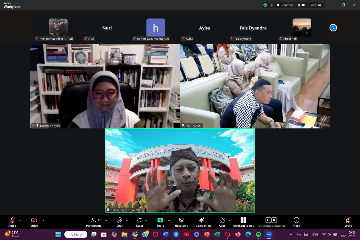 Acara dibuka dengan sambutan Dekan FISIP UNDIP, Dr. Drs. Teguh Yuwono, M.Pol.Admin., yang menyampaikan apresiasi atas kehadiran narasumber.