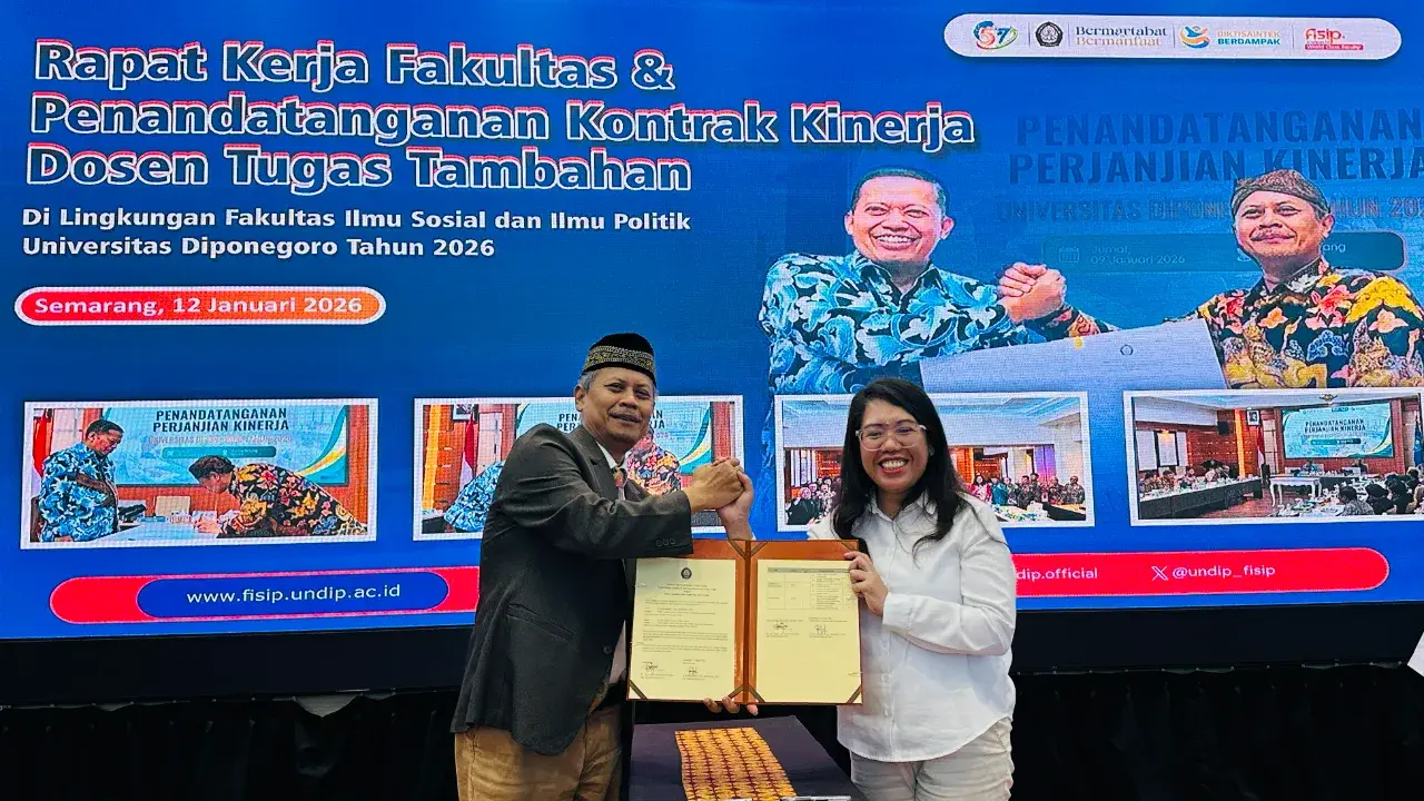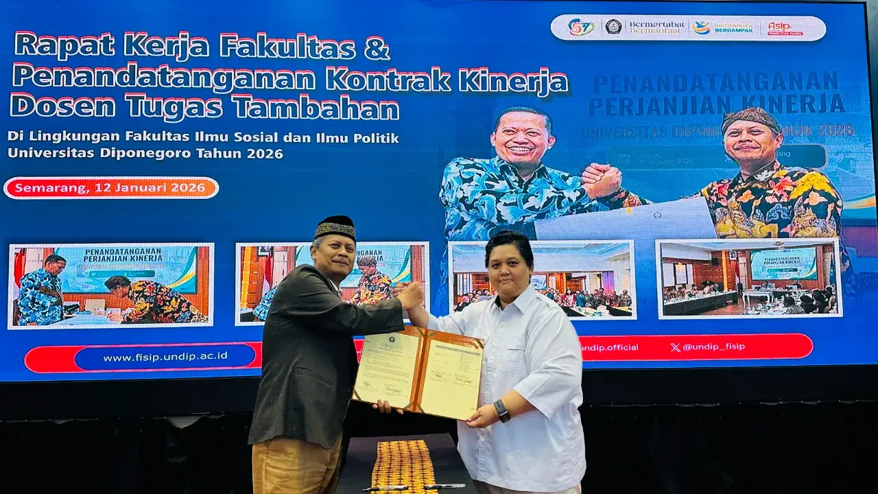 Fakultas Ilmu Sosial dan Ilmu Politik (FISIP) Universitas Diponegoro (Undip) menyelenggarakan kegiatan Rapat Kerja Fakultas dan Penandatanganan Kontrak Kinerja Dosen Tugas Tambahan sebagai bagian dari penguatan tata kelola dan komitmen kinerja institusi. Kegiatan ini dilaksanakan pada Senin, 12 Januari 2026, bertempat di Ruang Auditorium FIMENA Gedung A Lantai 3 Kampus FISIP Undip, Tembalang.