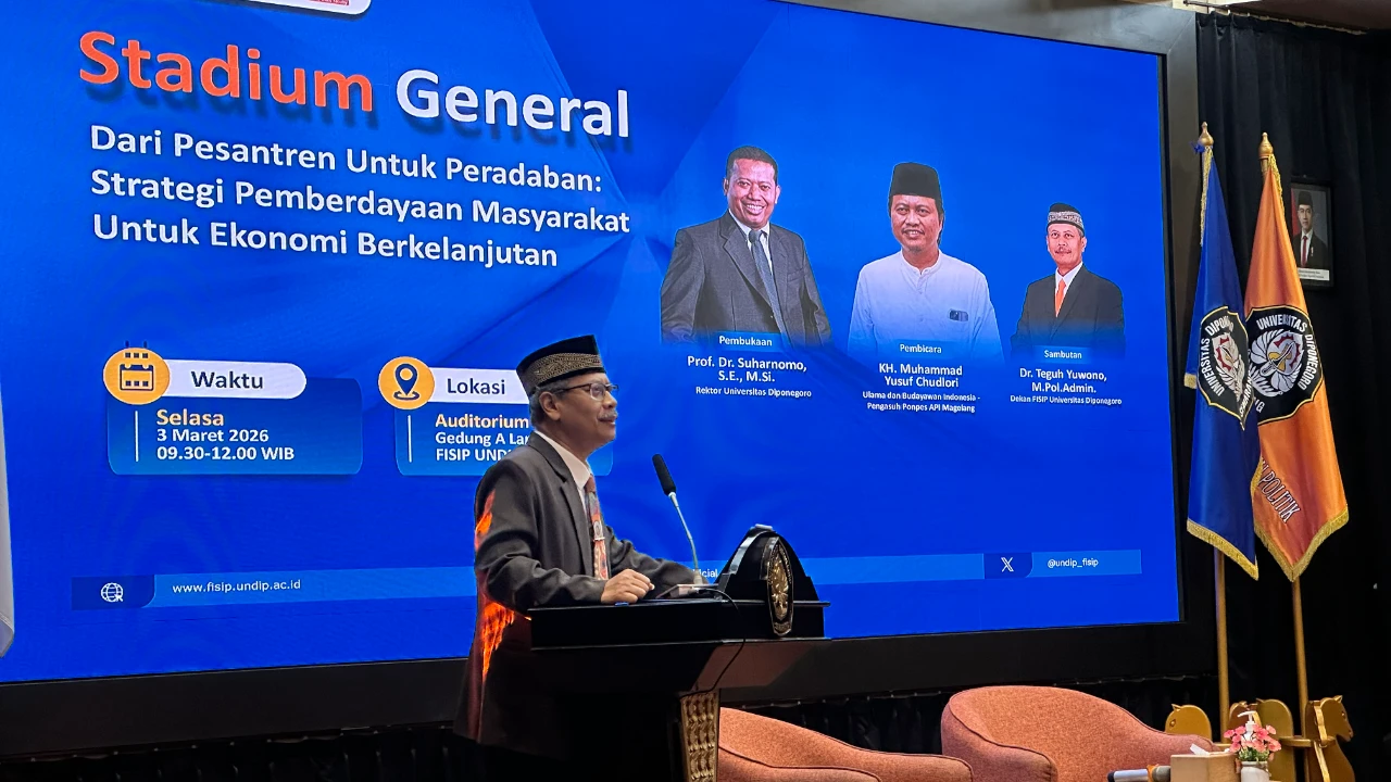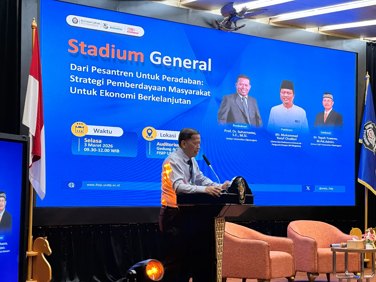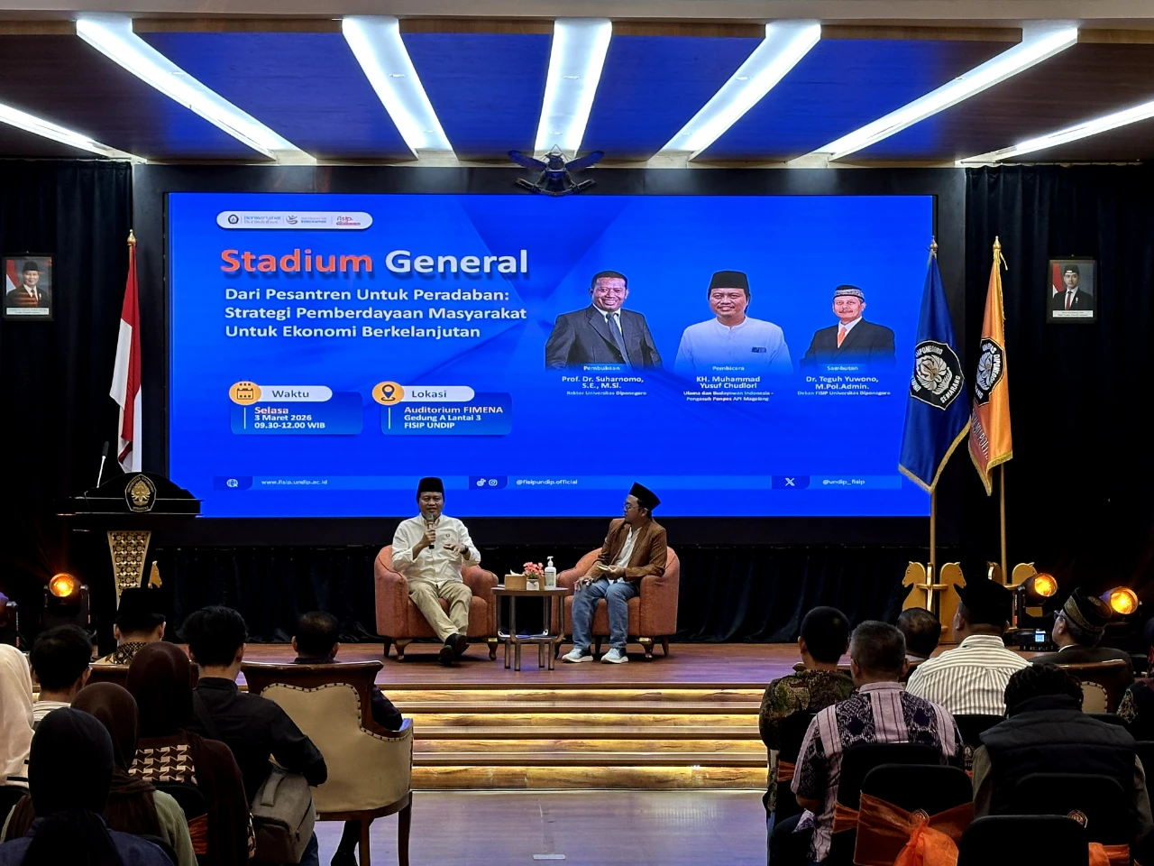 Semarang (03/03) – Fakultas Ilmu Sosial dan Ilmu Politik (FISIP) Universitas Diponegoro (Undip) menggelar kegiatan Stadium General bertajuk “Dari Pesantren untuk Peradaban: Strategi Pemberdayaan Masyarakat untuk Ekonomi Berkelanjutan” pada Selasa, 3 Maret 2026. Acara yang berlangsung di Ruang Auditorium FIMENA Gedung A Lantai 3, Kampus FISIP Undip Tembalang ini menjadi wadah strategis untuk merumuskan peran lembaga pendidikan, baik perguruan tinggi maupun pesantren, dalam pembangunan masyarakat. Kegiatan ini merupakan perwujudan nyata dari visi Undip Bermartabat, Undip Bermanfaat, yang tidak hanya menekankan pada pencapaian akademik, tetapi juga pada kontribusi nyata bagi kemaslahatan umat dan kemajuan peradaban bangsa.