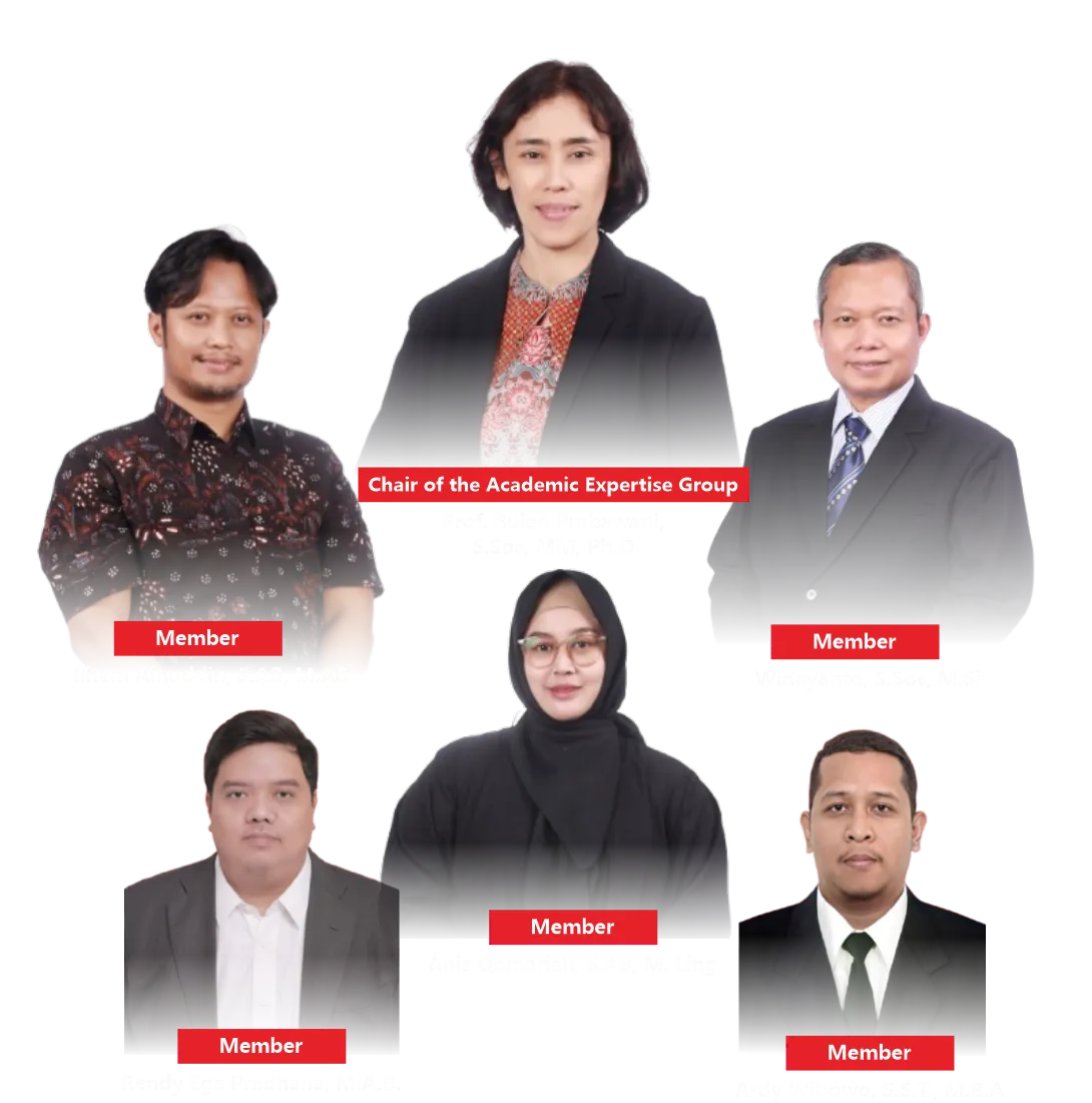 The Academic Expertise Group on Bureaucracy, Central, Regional, and Village Governance focuses on governance studies across various administrative levels, from central to village governance. Through the World Class University program, this group has hosted a World Class Practitioner from Transparency International Indonesia (TII) to share knowledge and best practices in strengthening transparent and accountable governance. Activities include public lectures with practitioners on education development collaboration, as well as assessment of final projects in collaboration between faculty and practitioners. All these activities aim to strengthen synergy between academics and practitioners, enhance education quality, and make tangible contributions to the development of good governance in Indonesia.